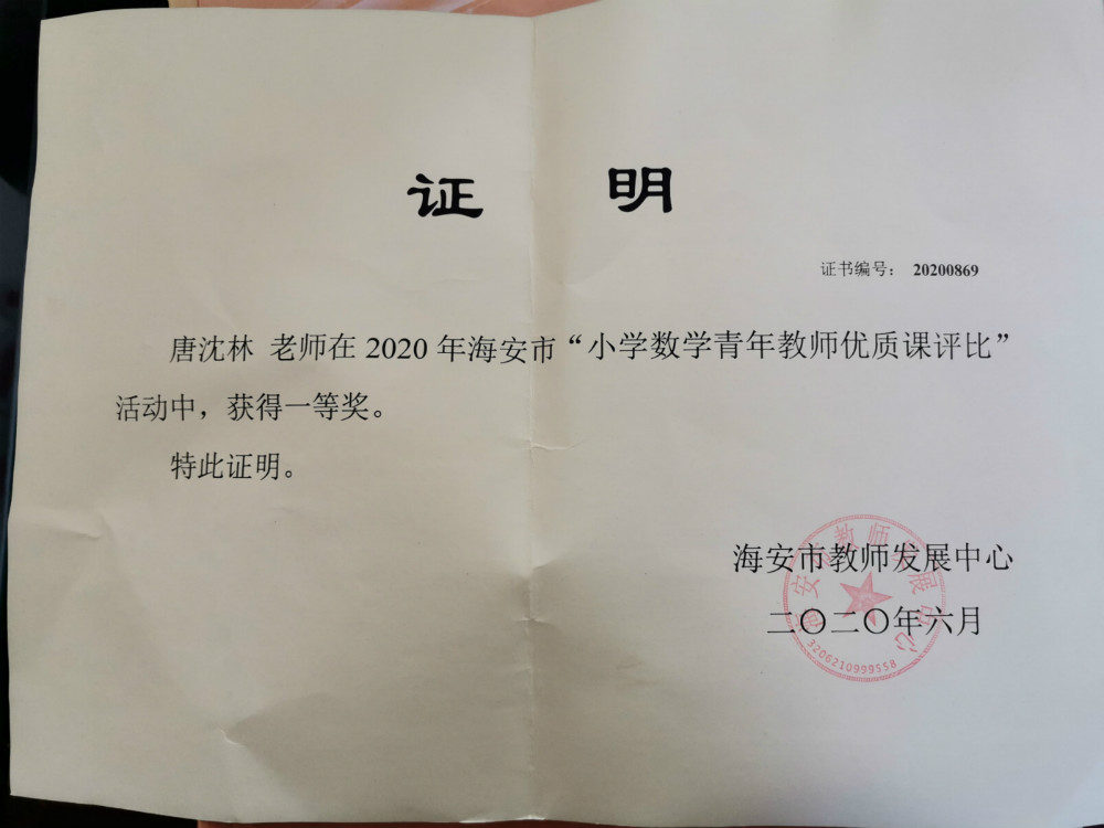 唐沈林主任获海安市数学课堂现场竞赛一等奖